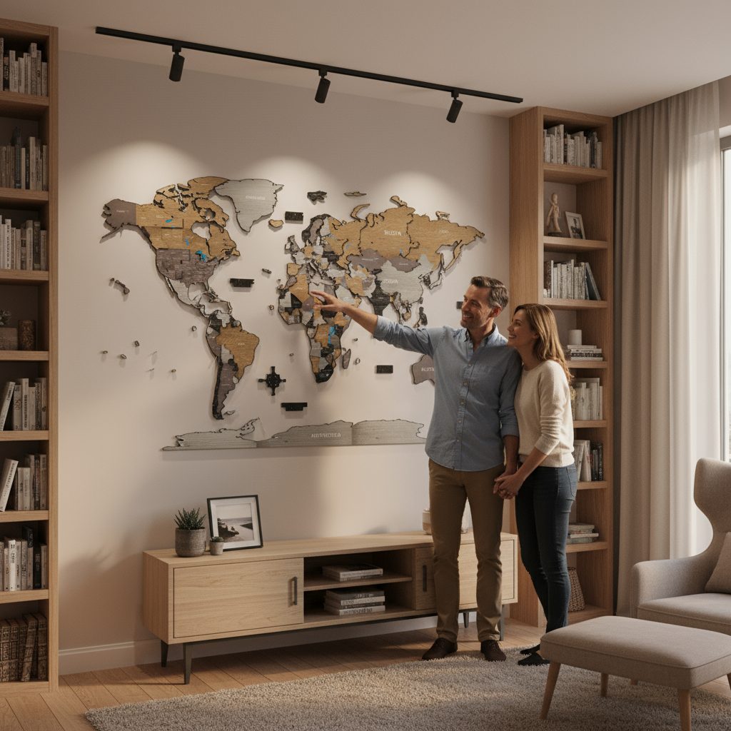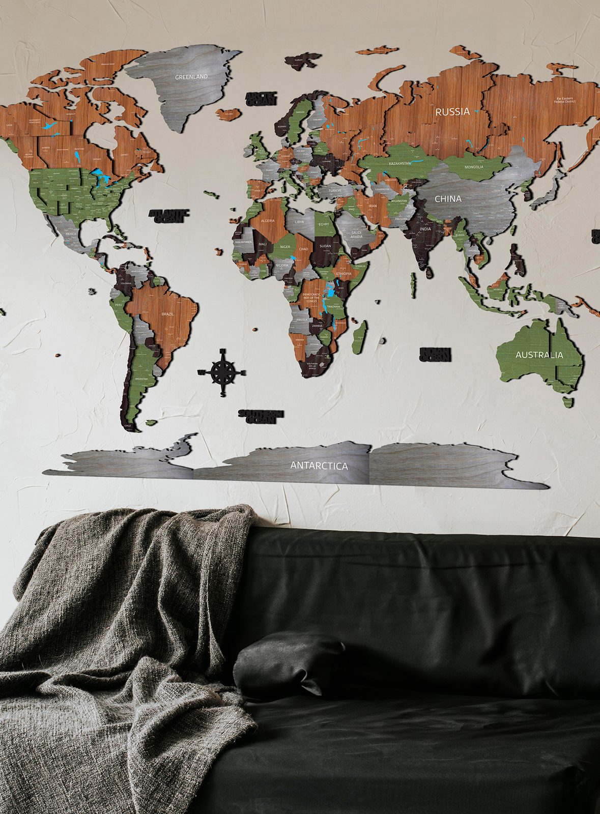 Každá mapa je ručně vyráběna z kvalitní HDF desky a vrstvena do realistického 3D efektu, díky kterému doslova ožije na zdi. Gravírované názvy zemí, oceánů a jemné doplňky, jako kompas, umocňují její cestovatelský charakter a prémiový vzhled.