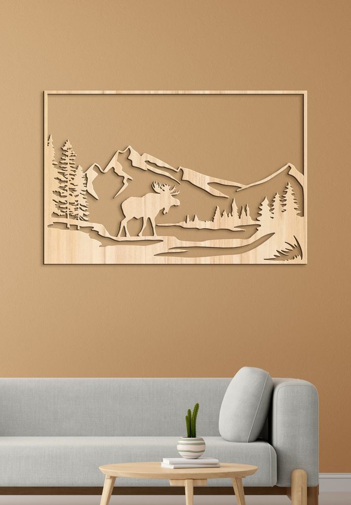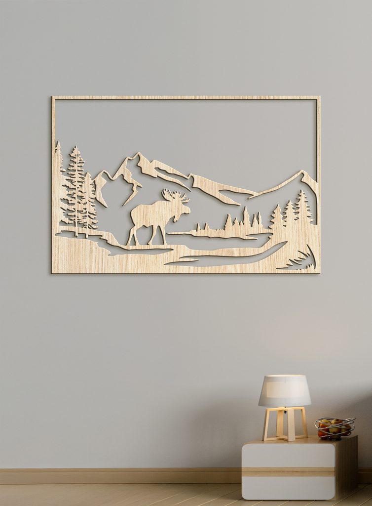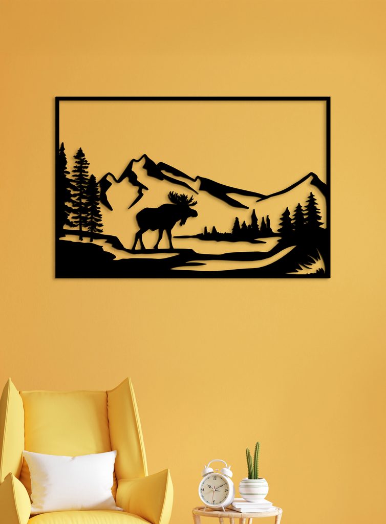 Tento nádherný dřevěný obraz z HDF zobrazuje úchvatnou scenérii se siluetou losa stojícího v popředí. Siluety losa, hor a stromů kontrastují s pozadím, vytvářejí silný vizuální dojem a zdůrazňují divokou krásu přírody.