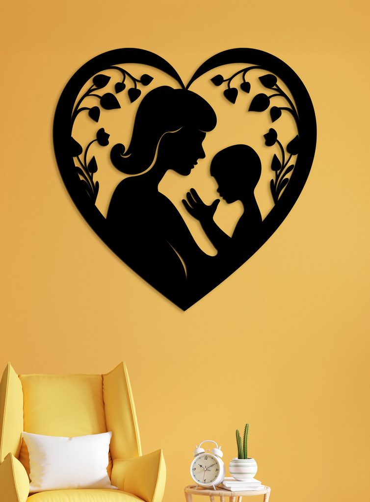 Tento dekorativní dřevěný obraz na zeď zobrazuje krásnou siluetu matky a dítěte ve tvaru srdce. Matka a dítě stojí proti sobě a dítě se natahuje k matce, což symbolizuje lásku a péči. Srdce je ozdobeno květinovými prvky, které obrazu dodávají dekorativní nádech. Tento obraz je dokonalým doplňkem pro ty, kteří chtějí ve svém interiéru vyjádřit rodinné pouto a vřelost.