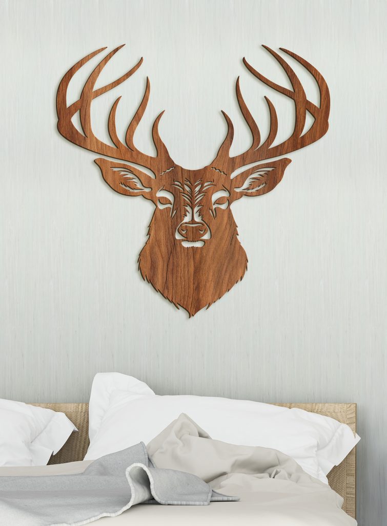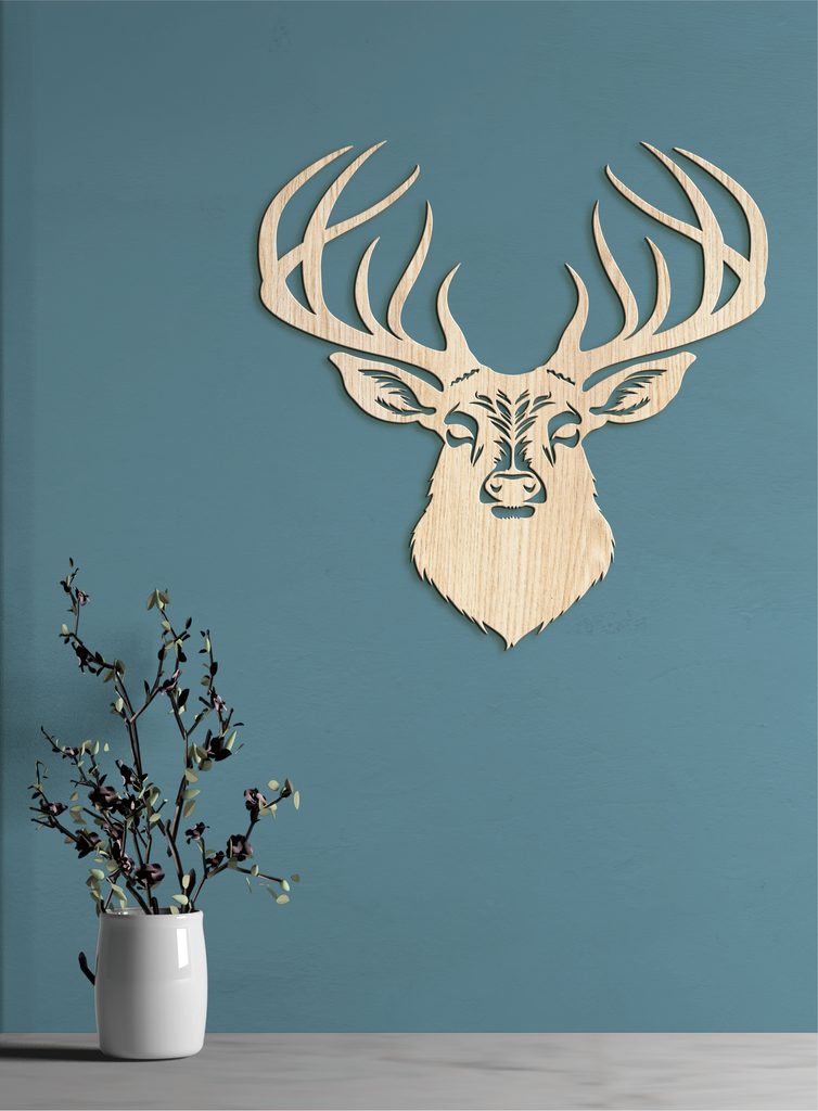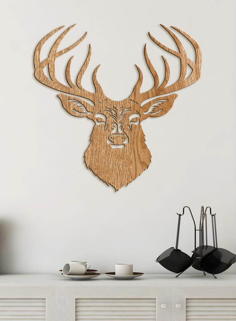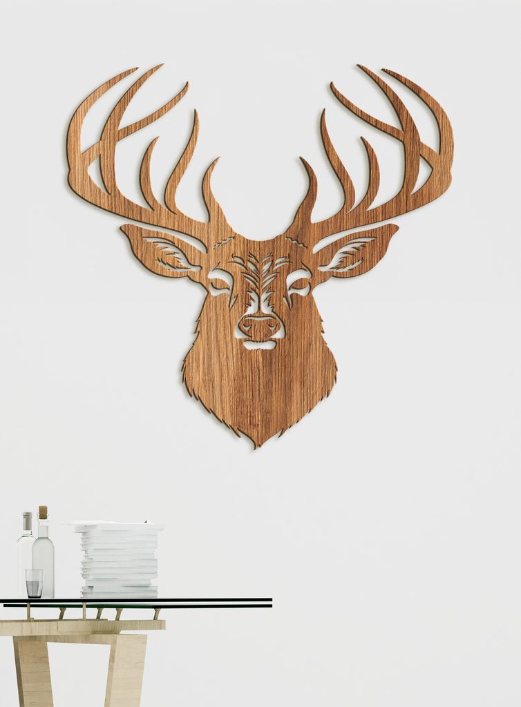 Tento dekorativní dřevěný obraz na zeď zobrazuje stylovou ilustraci jelena s výrazným, detailně propracovaným parožím. Hlava jelena je propracovaná do nejmenších detailů.
