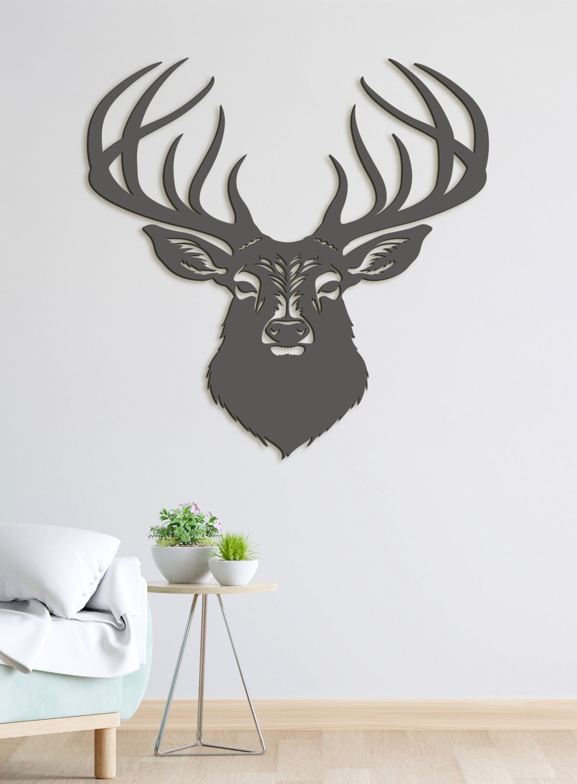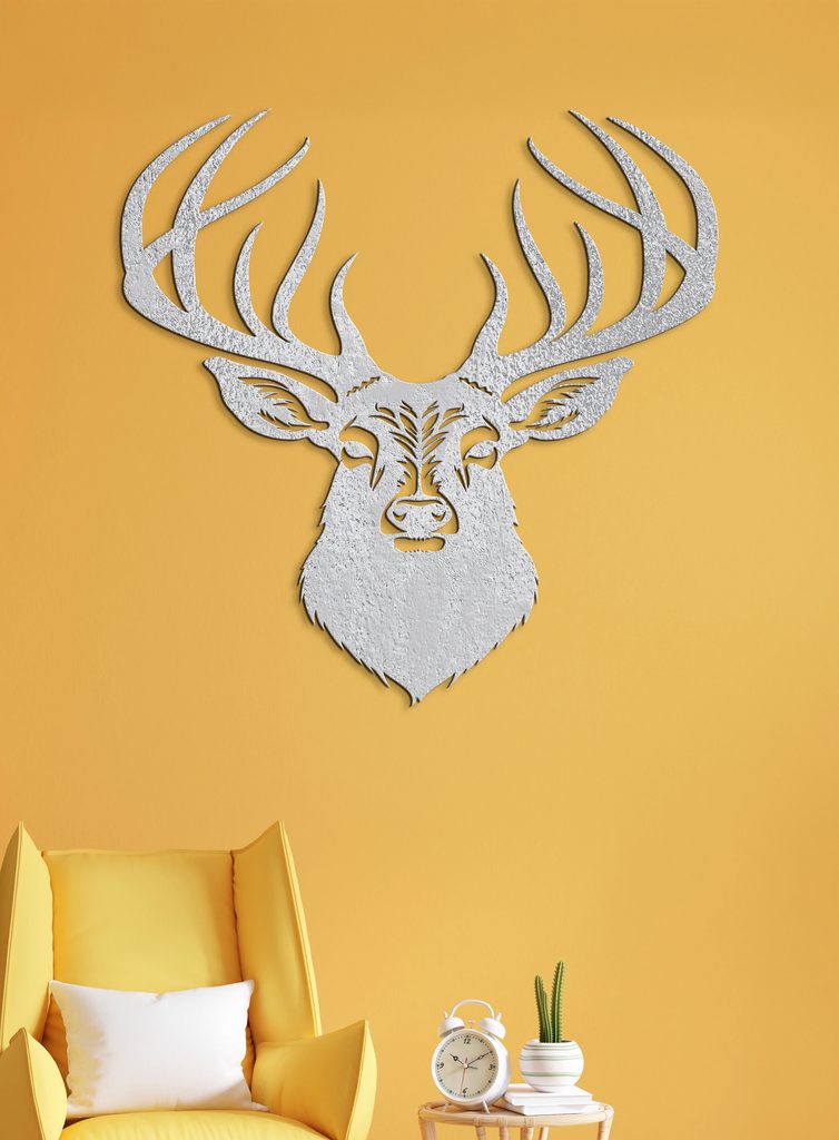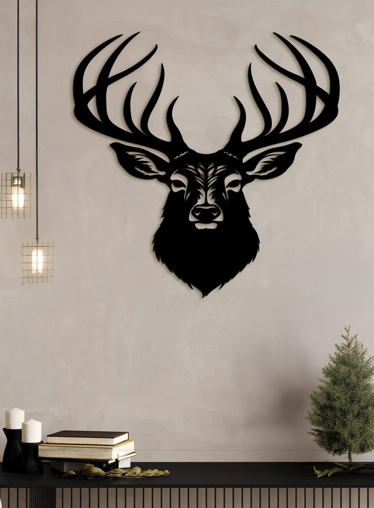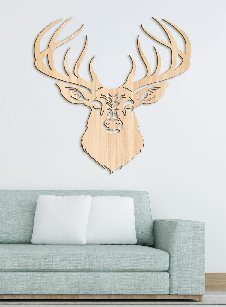 Tento dekorativní dřevěný obraz na zeď zobrazuje stylovou ilustraci jelena s výrazným, detailně propracovaným parožím. Hlava jelena je propracovaná do nejmenších detailů.