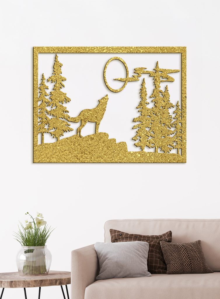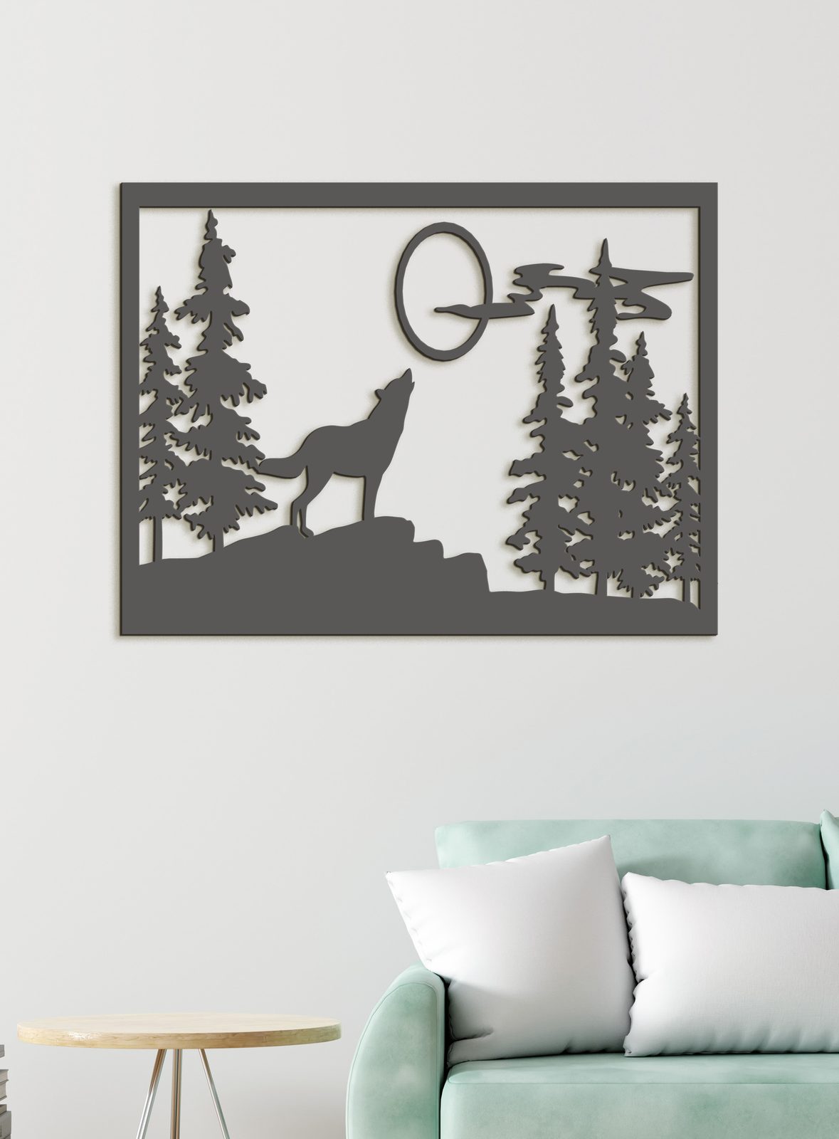 Tento krásný dřevěný obraz zobrazuje siluetu vlka vycházejícího k měsíci, obklopeného borovicemi. Vlk je umístěn na skalnatém výběžku, zatímco měsíc je zobrazen s několika mraky v jeho blízkosti. Tento obraz zobrazuje klasický výjev z divočiny, který je často spojován s tématy přírody, samoty a divočiny.