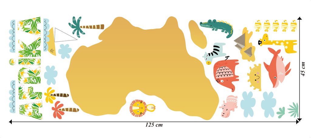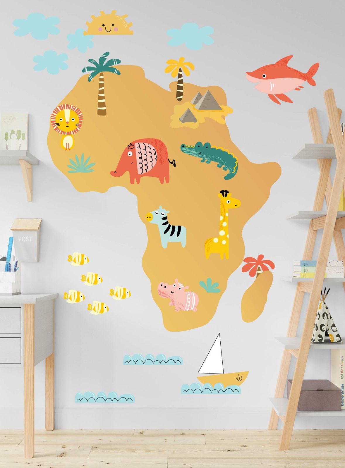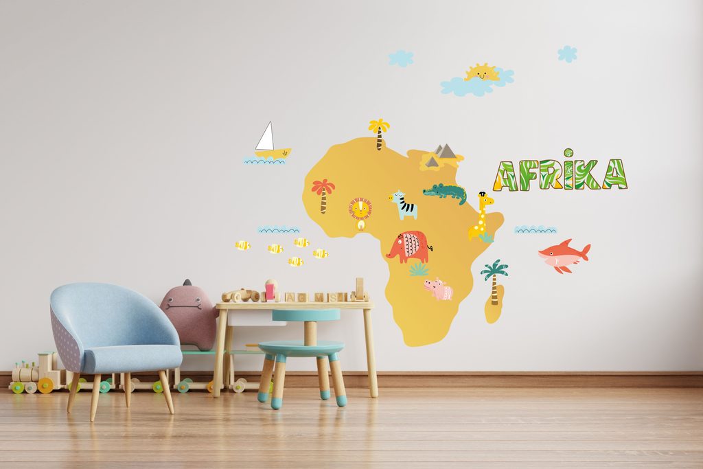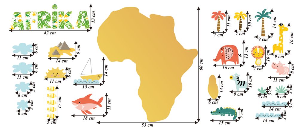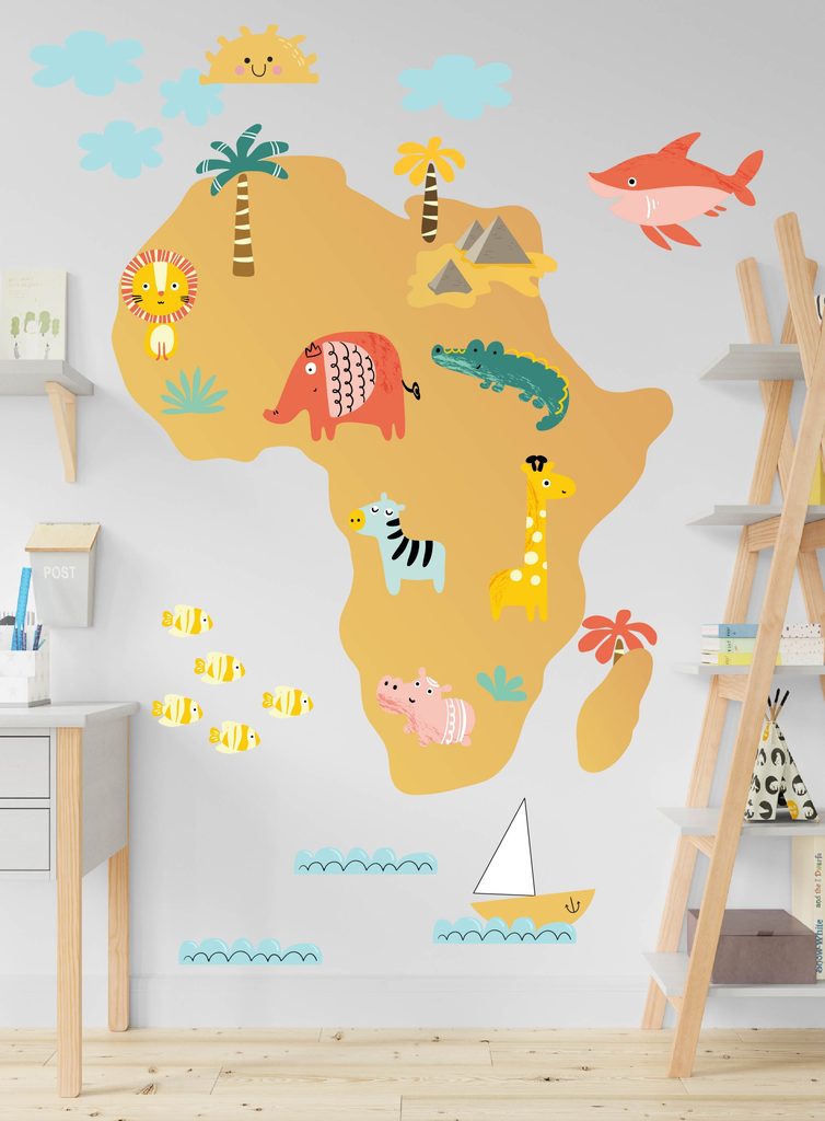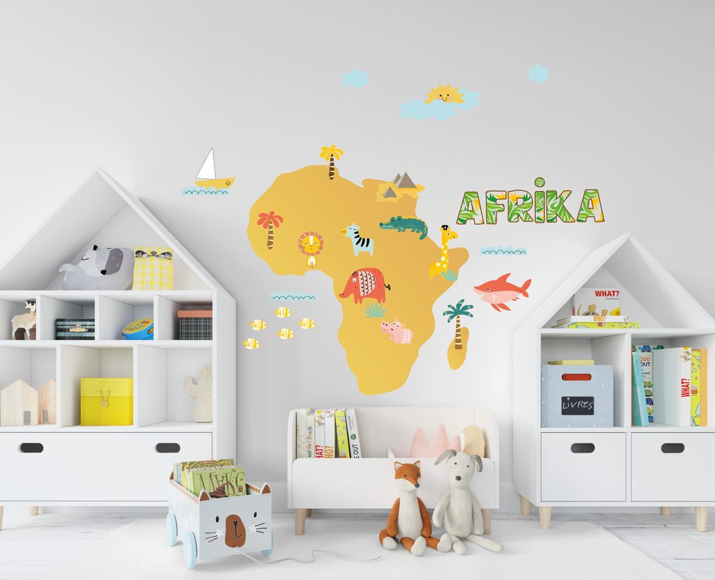 Vydejte se na dobrodružnou cestu Afrikou! Naše samolepky na zeď s mapou Afriky a roztomilými zvířátky jsou dokonalým doplňkem do každého dětského pokoje, který touží po vzdělávací a zábavné dekoraci. Barevné ilustrace a jednoduché tvary podnítí dětskou zvědavost a představivost.